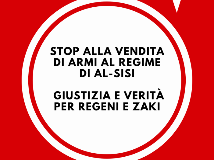 Stop alla vendita di armi all’Egitto, un forte impegno per avere verità e giustizia per Giulio Regeni, per la liberazione di Patrick Zaki e per dare subito seguito alla dichiarazione del Consiglio per i diritti umani dell’Onu, sottoscritta anche dall’Italia, con la richiesta di porre fine alla sistematica violazione dei diritti umani nel paese.